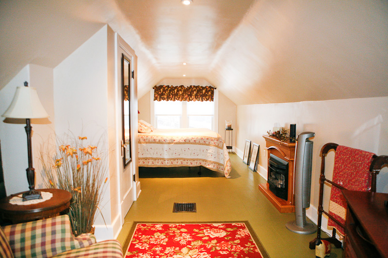 The second floor bedroom has a European loft feel to it. The California king size bed is lined with a hand-quilted spread and decorated on either side with two night stands. You can enjoy the quiet feel of a down-home country town or sit back, relax and enjoy the cable television. Either way, the hours will slip through your fingers and the prospect of returning to this beautiful city and home will revive itself again and again.